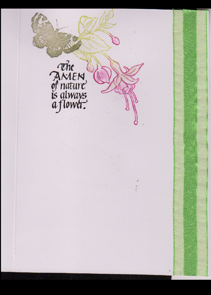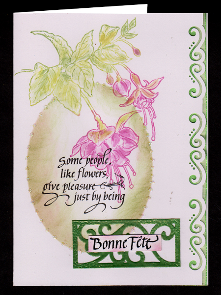 I Side folded my white card and punched the edge with an EK Success "Scroll Dot" punch. Placed a piece of green gauze ribbon on the inside edge to show through the punched element. Stamped my flower image using Memento dye ink pads "Lilac Posies" for the flowers and "Pear Tart" & Bamboo Leaves" for the foliage, misted with water and stamped. Filled in the flower area with a Wink Of Stella clear iridescent brush and then using a water brush and dipping it in to the stamp pad inks. Die cut an oval (Spellbinders) to get a stencil of the largest size. Sponged Distress "Forest Moss" around the edges and then went over it with "Picked Raspberry". Stamped my quote using Versafine Black Onyx. Added dots of a Quickie Glue pen around the edges and sprinkled with Stickles fine glitter "Star Dust". Punched the scroll piece (EK Success "Scroll Pattern") for the Bonne Fete sentiment. Trimmed it down, inked with Distress moss, embossed with Zing "Green Metallic" embossing powder. The sentiment stamped with the black and trimmed close and then adhered to the scroll piece and onto the card. On the inside, stamped and colored part of the flower again same as front. stamped the quote with the black. Stamped the butterfly with the moss and embossed with pearlescent embossing powder. |