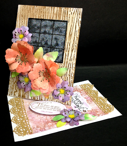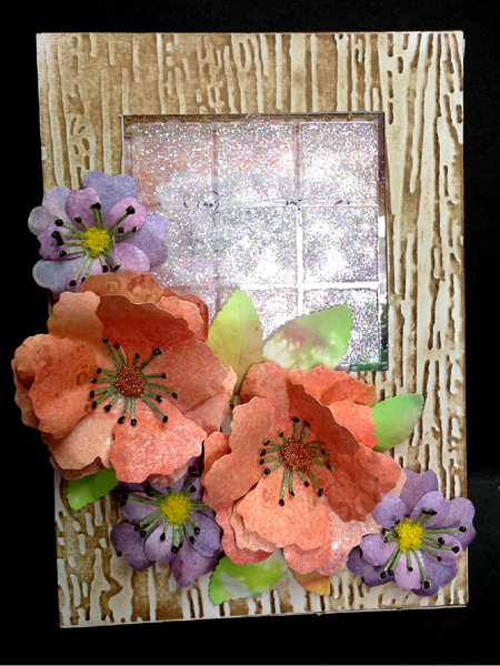 I cut, scored and folded my white cardstock. Window: clear Graffix .007 plastic, Dreamweaver stencil #LJ811 and translucent paste spread onto plastic, and while paste was wet and stencil still adhered to my plastic, sprinkled with glitter (Premium Fashion Glitter). Allowed the paste to semi dry and then removed the stencil. Set the plastic aside to finish drying. The woodgrain front was white cardstock embossed with Spellbinders m'bossibilities (woodgrain/brick) folder. Sponged Distress "Old Paper" all over then hit the high points with "Gathered Twigs". Cut another piece of white cardstock, same size as woodgrain piece to sandwich my clear plastic between. Cut an opening in both layers. Cut the plastic piece from above down to size (only used 3 x 3 window openings) and adhered to white layer, then adhered the woodgrain layer and adhered all of this onto front flap of card. The flowers were die cut from gelli plate prints I made the other day using dye ink pads, stencils, misted with water etc. The poppy die (Sizzix Susan's Garden) I picked up a couple months ago. The purple blossoms are a new die (Spellbinders "Bloom 3") that I really love. Used a large balled stylus and a mat to shape the petals prior adhering all the elements. The stamen pieces I added Viva Pearl Pen brown dots to their ends. The center of the poppy is a large glob of glue and pressed with gold mini beads. The yellow centers of the purple flowers is another glob of glue with yellow Flower Soft. I also misted the poppies with Perfect Pearls "Perfect Pearls" mist. The leaves are from my stash and also shaped. |