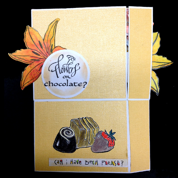 I die cut the lace border (Die Versions "Crochet Lace") and adhered to the left side of the back flap. Added one of my glitter butterflies (only have a couple left sigh!!) When the card is closed, on the front I stamped the sentiment with the black, die cut with the circle die set and sponged with the marmalade. Stamped the chocolates with the black, clear embossed. and colored with Prisma colored pencils then fussy cut around them and adhered to card. Wrote in my words with a Zig Writer, trimmed close, sponged with a dirty yellow sponge and colored some of the letters.