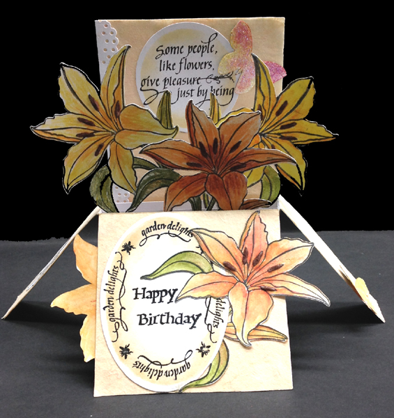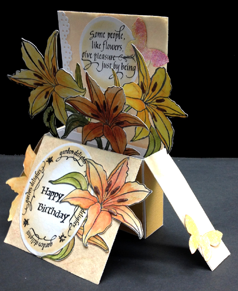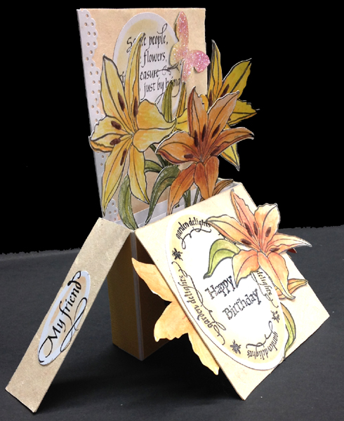 I cut my white cardstock to 11'w x 7"h, scored at 1", 5", 6", 10". Then scored it along the long side at 3" - the box is basically 3"h x 4"w x 1"deep and the flaps are 4"w x 4"h & 1"w x 4"h. The inside structure piece is 3/4" d x 4"w by about 2"h. It's adhered to the card while the card is in the open and flat stage on the right, then glue applied to the left flap and the box closed on to it, then the box tab is adhered. I DID NOT fold over the back flap so when the box is opened the back flap stays up straight and becomes a backdrop for the scene. I covered all my panels with a light yellow mulberry paper leaving a scant border all around so it doesn't interfere with the creases. The lilies I had eCut previously for a watercolor card I was making. It's a Michael Strong stamp, which I created a silhouette image and then eCut, then stamped with Versafine Black Onyx and clear embossed, then colored either with Derwent Inktense watercolor pencils and a wet brush, or Prisma colored pencils. When dry, I put a glob of glue on each stamen and pressed brown flocking in to it. Stamped the text, quotes etc with the black and die cut with Spellbinders ovals or circle sets, then sponged with Distress "Dried Marigold". |