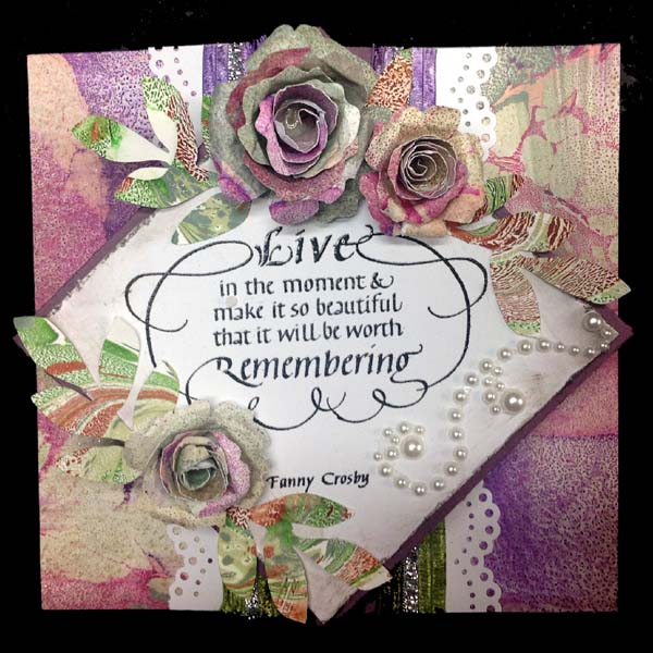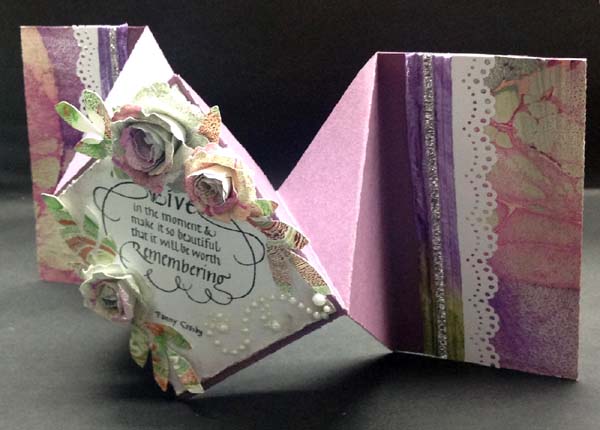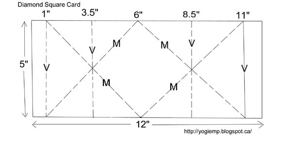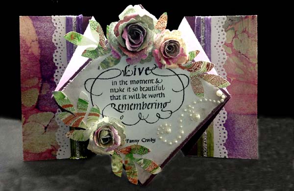 I scored and folded my purple card (See diagram below). Cut 2 more pieces from the same purple cardstock (2.5" x 5" ea) and adhered them to the backs of the flaps. Cut some of my marbled paper I made eons ago and adhered to both flaps. Punched the lace border (Martha Stewart) from white cardstock and adhered to flaps. The adhered some variegated Sari ribbon in a purple/green tone. Stamp the quote with Versafine Black Onyx and clear emboss on white cardstock. Used Tim's distressing tool to rough up the edges. Sponged with a dirty purple sponge. Adhered to front. eCut/die cut some roses in various sizes from the same marbled paper. Used a large balled stylus to shape the petals. Glued them down with a hot glue gun. eCut some rose leaves from a greenish marbled paper. As a final touch, added a flourish of white pearls |