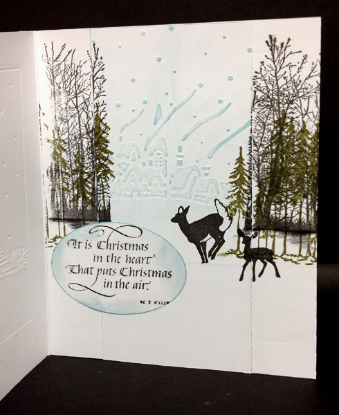 I folded my white cardstock. Cut apart my Cuttlebug embossing folder "Winter House" and taped hinge tabs to the top of it so that my folder would land where I wanted it... Ran through my machine, then sponged a bit of Distress Tumbled Glass" over the high points and around the edges. Stamped the sentiment with Versafine Black Onyx and clear embossed. Stamped the deer (from the same set) with the black. Cut the snowflakes and hit one of them direct to paper with the blue. The other one I inked with Versamark and embossed with "Silver Fire Opal" embossing powder (by Embossing Arts Co.). Glued the two together off set then on to the card. Added the rhinestone cluster to the center. On the inside, embossed another of the cuttlebug scene, sponged high points with the blue, trimmed it down and adhered to the center. Stamped the bare trees (Just For Fun), with the black, masking of the edges. Stamped the pine trees (Just for Fun) with Distress "Forest Moss" misted with water. Stamped the deer with the black. Put a bit of black shading on the tree line base to blend with the scenery. Stamped the quote on an other piece of white cardstock, die cut with Spellbinders oval die, sponged with the blue and adhered to card. |