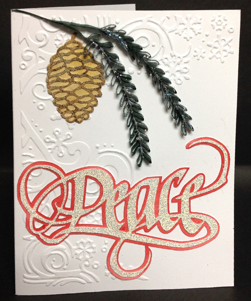 Created: November 15, 2014 So a few more sprigs of pine bough I created this past quilling session. Still have two more.. I'm using a couple of Xmas stamps from Quietfire Design ("Glory to God..." ); ("Christmas is the Day" 9pce set) and an eCut "PEACE" which will be available soon on the Silhouette onLine store.