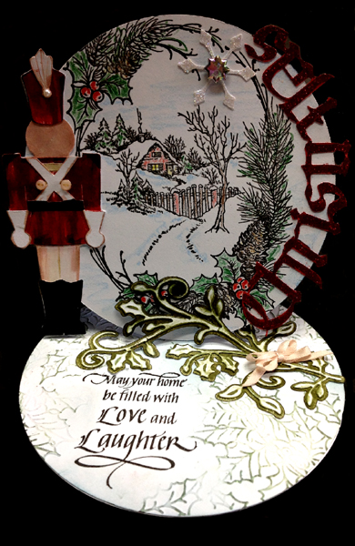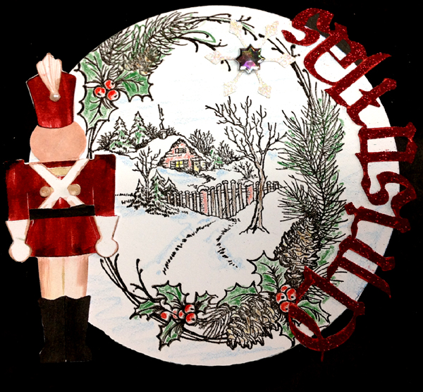 I folded my white cardstock and cut both layers using my EK Success circle cutter, cutting it shy of the folded edge. Then folded the top circle in half to create the easel shape. Cut 2 more circles the same size to layer on top of both the front and floor of the card after decorating them. Stamped the winter scene (Stampendous "Christmas Cottage") using Versafine Black Onyx on the spare circle and clear embossing. Colored with Prisma colored pencils. Adhered to card front. Die cut the toy soldier (Sizzix Tim's Bigz die) and colored with Distress markers, then glued the elements together and on to card front. Added two micro beige buttons on his chest area, and a mini white pearl on his head piece. eCut the "Christmas word from white cardstock and while on the mat, colored with Distress pads direct to paper in various reds. Since the word is very open, it was easy to shape/glue and stick around the edge of the circle. After adhering, used a Quickie glue pen on the letters and sprinkled with Ritz micro fine glitter "Regal Red".