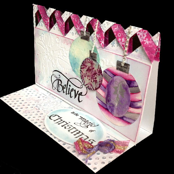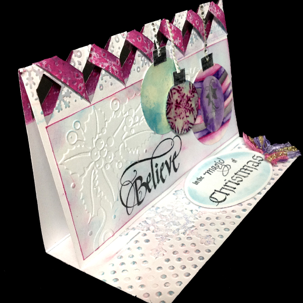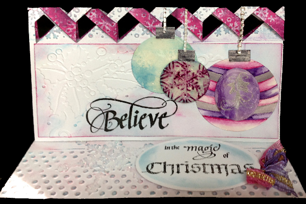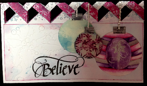 I ecut, colored, embossed, scored and folded my white cardstock. After eCutting I hit the inside part of the eCut with Distress "Seedless Preserves" then embossed with the snowflakes from Cuttlebug Winter Borders set, moving the folder several times to do the whole area. Hit the high points with "Picked Raspberry". On the other side I hit it with "Tumbled Glass" then with "Spun Sugar". Scored down the middle and folded the cuts & card. Scored again to make the easel part which will be covered with another piece of cardstock further down. Cut another piece of white cardstock, slightly smaller than than my front section, embossed it with Crafts Too embossing Folder "Holly". Sponged around the edges with the Tumbled Glass & the Raspberry. Hit the edge with the raspberry pad, dried and adhered to front of card. Stamped the sentiment with Versafine Black Onyx and clear embossed. Die cut several sized circles (Spellbinders) from watercolor paper. stamped the medium one with Versamark and the snowflake and clear embossed. Painted with light blue. The largest ball was painted in stripes of purples & pinks. Stamped the flourish star on another piece of cardstock, embossed with silver embossing powder and die cut with a small oval die (Spellbinders) and adhered to ornament. The smallest ball was embossed with a snowflake embossing folder, high points hit with Preserves. |
