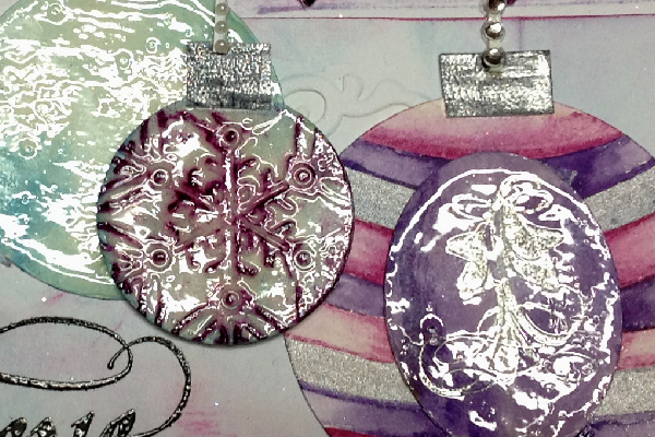 Inside Cut a piece of cardstock, inked with Versamark and embossed with silver embossing powder, then cut into small pieces to use as the hanger section. Applied glossy accents to the two smaller ornaments and on the oval piece of the larger one. when dry adhered to card. |