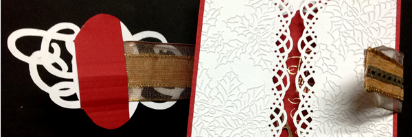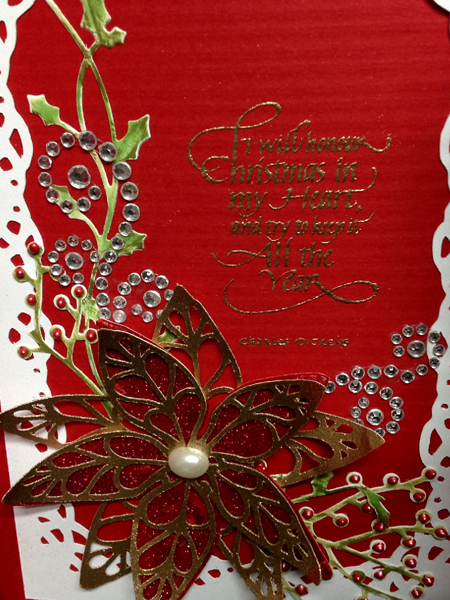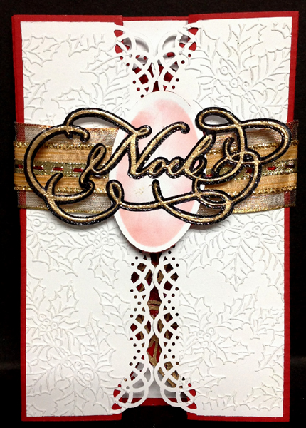 I scored and folded my red textured cardstock, then started making my white over pieces. Used Martha Stewart punch around the page Layered Arches" for the front panels, trimmed them down and then embossed (Sheena Douglas "Holly"). adhered to panels. Created a similar design for the inside and used my electronic cutter to make the frame. Adhered to inside. Stamped the quote using Versafine Toffee and embossed with Queen's Gold embossing powder. eCut the poinsettia petals. For the open work ones I inked with the toffee and embossed with the gold. For the solid piece I colored with Distress "Barn Door, applied a layer of white glue and sprinkled with Glitter Ritz micro fine glitter "Regal Red". Adhered the layers together and added a large white oval pearl. Die cut my various greenery (eCraft Designs "Berry Branch"; Memory Box "Holly Vine") from white cardstock and used Distress Mini pads in various greens. For the Berry branch added Liquid Pearls "Red" dots. Adhered all my floral elements, then added a few rhinestone flourishes. Adhered 3 different ribbons together, a wide gold gauze, then a gold thread edged gold ribbon (both of these were wired), then the narrow gold/red ribbon using Sookwang tape. Adhered it to the back of the card and then created a picot edge (protecting the wires) on one end. eCut the word "Noel" from white cardstock, inked with the toffee and embossed with the gold. eCut a shadow layer and colored with a black Sharpie marker. Adhered the two elements together, then inked with Versamark and clear embossed. Die cut the oval (Spellbinders), sponged with some red and adhered the eCut word. Adhered one end of the ribbon using a glue gun to the oval, then adhered a piece of red cardstock to the oval (with some give so that other end of ribbon could fit into it). |