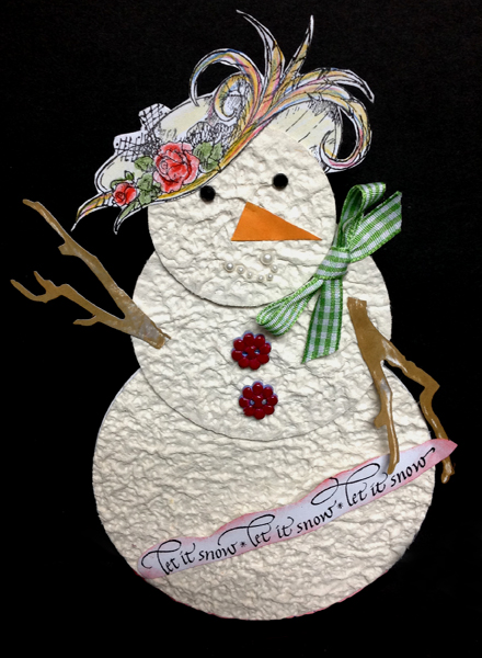I scored and folded my white cardstock and taped it to my table, then cut with my EK Success circle scissor through both layers. Folded the front in half to create the easel. Cut another circle for the large part of the body, then die cut the two smaller circles (Spellbinders "Circle die set") from both white cardstock and a heavy textured cardstock (Lava Paper). Adhered the cardstock circle to the Lava cardstock, then adhered the circles together to form the snowman and onto the card front. Stamped the hat (Rick Saint Denis "Hat Hope") onto white cardstock, colored with prisma colored pencils and fussy cut around it. Slit the hat to fit the head into it and adhered. Adhered black rhinestones for the eyes, pearl flourish for the mouth and cut a triangle of cardstock for the nose, coloring it with Distress "Ripe Persimmon". Tied a green/white checked bow and adhered that. Didn't have red buttons, so colored with alcohol markers... but they turned it a purple-y color, so applied Versamark on the buttons and embossed with red embossing powder, then adhered with a glue gun. Die cut and adhered the arms using Tim's "Tree Branch" die and white cardstock. Colored with Distress "Pumice Stone", then "Gathered Twigs". Stamped the sentiment "Let it Snow" onto white cardstock with Versafine Black Onyx. Wavy cut around it and sponged around edges with a dirty red sponge. |