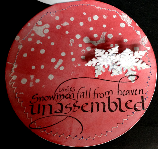 Floor On the floor, colored another circle with "Festive Berry" and used my sewing machine to zig zag a design around the edges. adhered to card base. Punched the snowflakes (Martha Stewart) a few times from white cardstock, applied glue and sprinkled with Stickles glitter "Star Dust", adhered it to another snowflake for strength and then onto the floor as a stopper. Did it again on a 2nd snowflake. Stamped the quote with the black, then used a fine tipped pen to cross out the word "men" and wrote in the word "ladies" (BIG GRIN) Stamped the polka dots (Prairie Rubber Stamps) to mimic snow using Versamark and embossing with white embossing powder. |