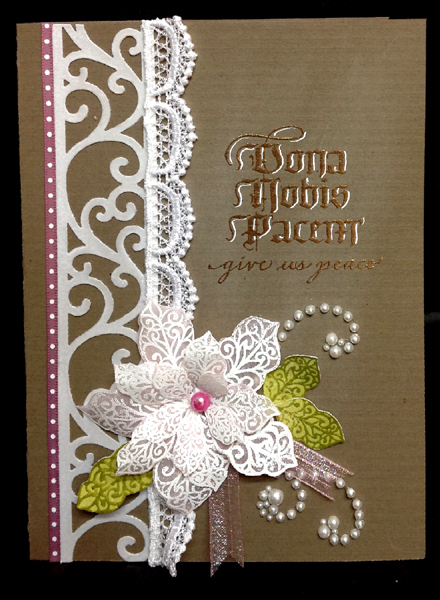 Side folded my craft toned textured cardstock. Adhered the punched border, then the lace trim, then a piece of pink/white dotted narrow ribbon. Stamped the quote using Versafine Toffee and embossing with Queen's Gold embossing powder. Shadow detailed with a pointed pen and my white mix (Copic white & H2º) Adhered the poinsettia and leaves, then added the ribbon tails and the pearl flourishes.