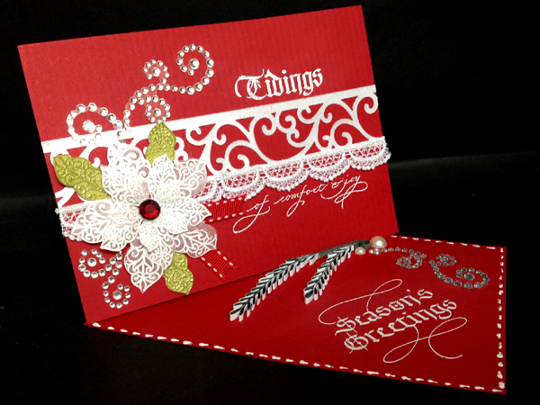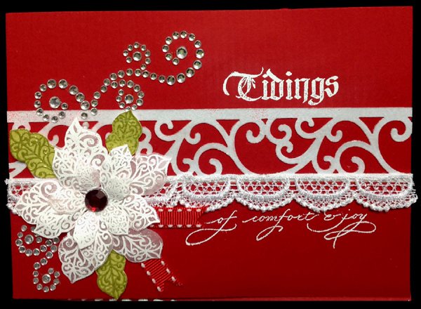 I cut, scored and folded my red textured cardstock to make my side easel. Punched out the center border piece (EK Success "Scroll Pattern") from white cardstock, applied Versamark all over and embossed with Pearl Lustre White embossing powder. Adhered to a separate piece of red texture cardstock the same size as card. Adhered the lace trim. Stamped the quote using the Versamark in two stages, masking of sections on each stage, then embossing with white embossing powder. Adhered my poinsettia using Golden's extra heavy gel medium. Adhered the red rhinestone center. Then added the rhi9nestone flourishes and the two red/white stitched pieces of ribbon. Adhered this panel to the card front. On the floor: Quilled a couple pine sprigs using two strips of quill paper at a time (white & green) and using my smaller combing gadget. Adhered to floor as my stopper. Added pearls and flourishes. Stamped the sentiment with the Versamark and embossed with white. Added the stitching detail using Ranger white Enamel Accents. |