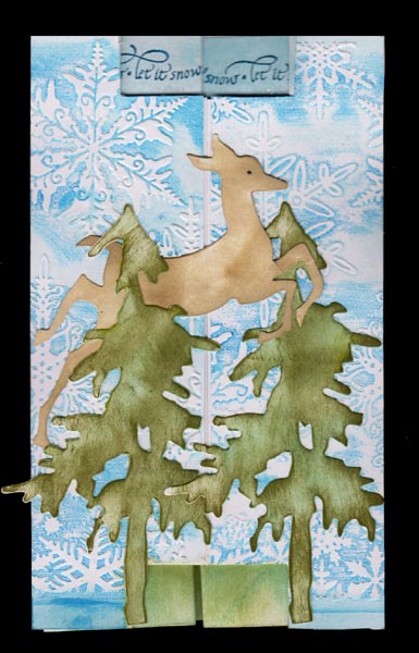 I cut, scored and folded my white cardstock. I embossed the snowflake backgrounds using Sheena Douglas embossing folder, applying Distress "Tumbled Glass" all over the solid part of the folder, then swiping over the area with "Salty Ocean", misting lightly with water, placing my white cardstock on the un-inked side and closing the folder, then running through my machine. Trimmed down and adhered to front and inside. Die cut the snow border on top (Sizzix Tim's "Snow Flurries"), coloring with the Distress pads, applying glue to the snowflake area and sprinkling with Glitter (Stampendous "Crystal Snow"), trimming down to fit, and adhering to each little section. Die cut the pine trees (Sizzix Tim's "Tree Line") and again coloring with Distress and trimming down. applied "Puffy Velvet" marker in white & heat activated. Cut another one to put on the inside main panel. Die cut Tim's Reindeer, sponged with "Old Paper" and then with "Brushed Corduroy". Added an eye to each and adhered to card. Stamped the house scene (Old Island) with Versafine Black Onyx. Stamped the inside quote on white cardstock using the black and clear embossed. Die cut with Spellbinders "Romantic Rectangles". Sponged some blue around the edges and hit the side edges with the Salty Ocean pad. Stamped the "Let it Snow" using Versafine "Blue Lagoon" several times. |