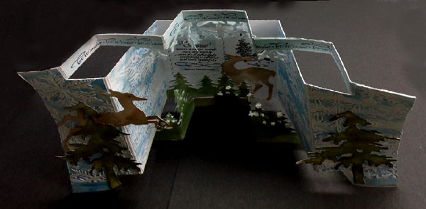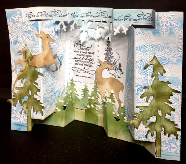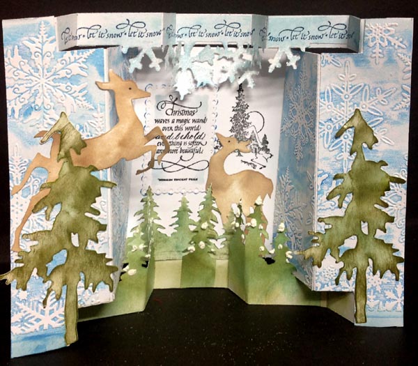 Created: October 21, 2014 I've been making a few styles of Gate fold cards lately... I was really in a mood to do an involved scenic one. I'm using two Xmas quotes from Quietfire Design ("Christmas Waves a Magic Wand" ); ("Let It Snow" small) |