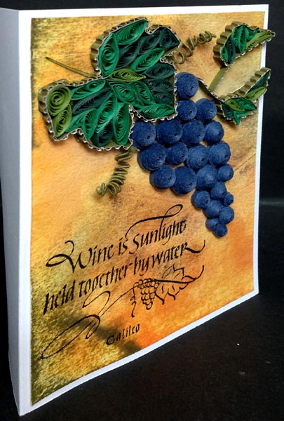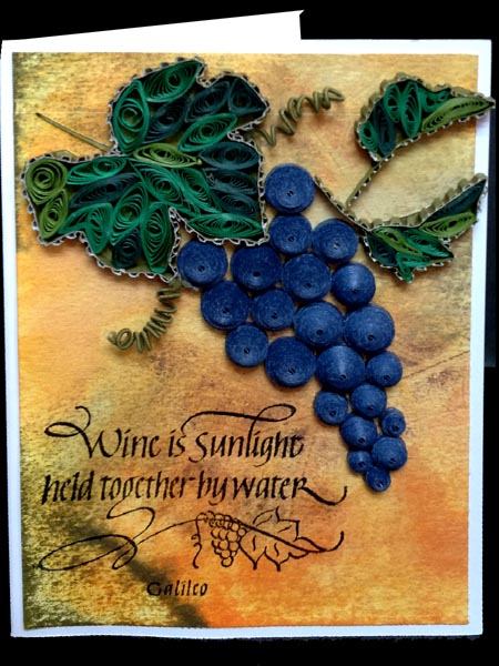 Created: October 10, 2014 I made the grapes at a previous quilling session in anticipation of these new stamps from Quietfire Design, then created the leaves at the last session. Finally putting it together... I'm using two quote stamps and the little grape doodle from Quietfire Design ("Wine is Sunlight" 4 pce set) |