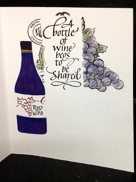 I side folded my white cardstock, layered with a decorated cardstock I made eons ago that had a leaf design. I think I used an actual leaf to kind of stamp on the cardstock. Adhered all my quilled elements. Used some of my corrugated cardstock quill strips as well to encase the leaves. I painted those strips with Distress acrylic Daubers "Peeled Paint". added those little curlicues using wired thread by Prima (a new acquisition...) Stamped the quote using Veresafine Black Onyx and clear embossed. On the inside eCut a wine bottle and colored with Sharpie markers. Stamped the grape doodle with Distress "Aged Mahogany" and wrote in the words "Red Wine" with a black micron. Stamped the quote with the black. Created a mask from tracing paper and stamped the grape cluster (Stampendous "Grape Label") only stamping part of the stamp with the black and colored with Prisma colored pencils. |