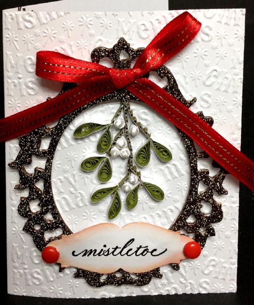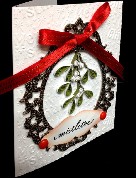 Created: October 18, 2014 I love this ornate frame from Sizzix and I thought it would pair up well with the quilled Mistletoe... I don't think I've every been kissed under the mistletoe, or for that matter ever stood under any... Wonder what I've missed in my life BIG GRIN I'm using a sentiment stamp on the front from Quietfire Design ("Christmas Cuddlers" 9 pce set) |
