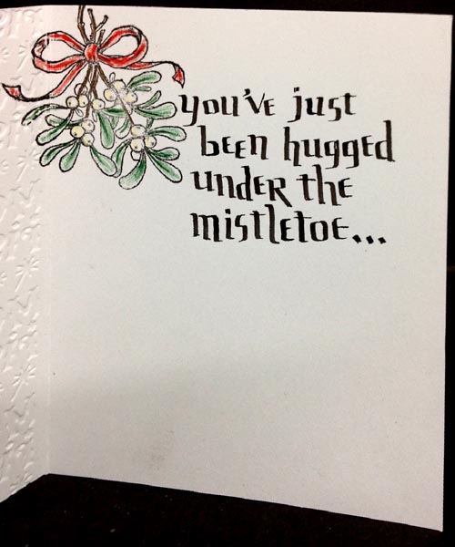 I side folded my white cardstock, embossed with Crafters Companion "Merry Christmas" embossing folder. Die cut the Ornate Frame from brownish mat board, applied Versamark all over and embossed with "Rustique Tin Can" embossing powder. Used a Distress brown marker to color the edges. Adhered to frame with 3D foam tape. Tied a red bow and adhered to frame with hot glue. Adhered my quilled elements. Used the corrugated cardstock from Quilled Creations for the stems which I had painted with a brown Distress acrylic dauber. Added Liquid Pearls "White Opal" to the berries. Stamped the sentiment using Veresafine Black Onyx and clear embossed. Die cut with Spellbinders "Grommet Tags" moving the die to get the length I wanted. Colored the edges with a dirty red sponge. Inserted two large red brads and then adhered to frame. On the inside wrote in my words in a funky calligraphy style using a 1.5 Parallel pen dipped in Sumi ink. words: "You've just been hugged under the mistletoe..." Stamped the mistletoe (Flourishes) with the black and colored with Prisma colored pencils |