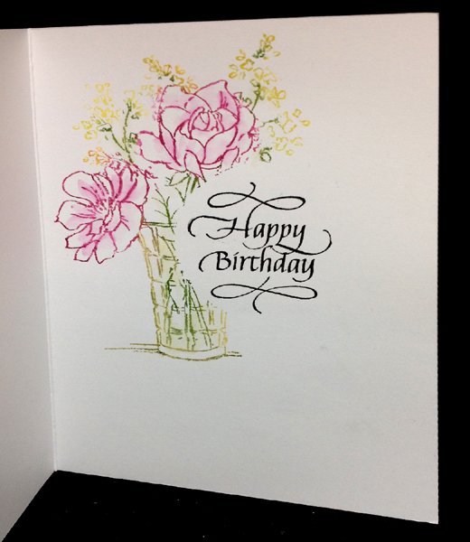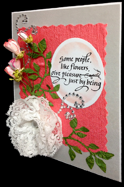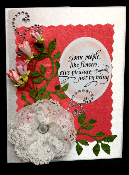 I side folded my white card. Adhered a piece of paper backed white silk (purchased eons ago...) leaving a scant 1/16" border all around. Adhered a piece of pink silk/moiré Stamped the quote with Versafine Black Onyx, clear embossed and die cut with Spellbinder's oval die set. Sponged some pink around the edges. Adhered to card. Die cut the leaf sprigs from green cardstock and embossed with Cuttlebug "Musical Flourishes". Adhered the leaves and some rhinestone flourishes. Added the lace flower with a white pearl brad center. adhered the rose buds. On the inside, stamped the "Happy Birthday" with the black, clear embossed and created a circle mask from tracing paper. Inked up my stamp (Stampendous "Vase Bouquet") using Distress markers, misting with water and stamping, leaving the stamp for a good minute to activate the colors. Then used a paint brush and some water to move the color around a bit. |