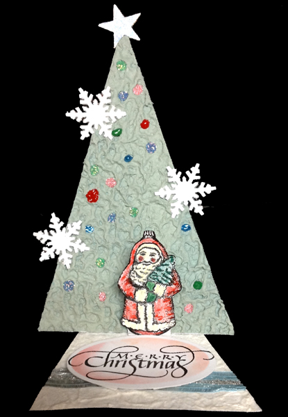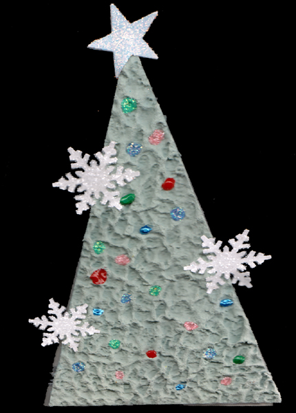 I scored and cut the triangle shale for the easel card. Adhered a piece of heavy textured green cardstock called Lava Paper. Punched out the star (Fiskar's Squeeze Punch) and the snowflakes (Martha Stewart) from white cardstock. Applied a layer of PVA glue and sprinkled with glitter. For the star I used Stickles "Star Dust" and for the snowflakes Stampendous "Crystal Snow". Applied various colors of liquid dots using Liquid Pearls, Stickles & Viva Pearl pens. Set aside to dry (takes a while...) On the inside: adhered a piece of white textured Mulberry paper to the floor. Stamped the snowman ornament (Flourishes) on white cardstock using Versafine Black Onyx and clear embossed. Cut around the image (and adding a small lip) and colored with Prisma colored pencils. Adhered to floor to act as the stopper. Stamped the sentiment with the black on white cardstock. Die cut with Spellbinder's oval die set, sponged some red around the edges. adhered a piece of blue Sari ribbon, then adhered the sentiment using 3D foam tape.