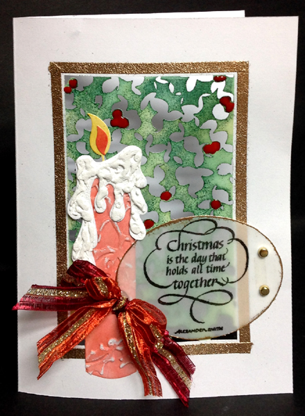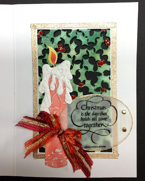 I placed my 8.5 x 11" white cardstock on my cutting mat and cut my open work design, then scored and trimmed my card to 5"w x 7"h. Used post it notes to mask of my design and sponged Distress "Peeled Paint" and then "Pine Needles", then embossed with Distress "Pine Needles". Put some thin Sookwang tape around the opening and sprinkled with Queen's Gold embossing powder and carefully heat set. eCut the candle (Dee's Distinctively), sponged "Worn Lipstick" on the candle base, ran through my embossing machine with Crafts Too "Holly" embossing folder. Sanded the high points. The wax drippings - I filled the area with Deco Arts Snow Writer and heat set. Sponged yellow and red on the flame and glued everything together, then onto the card. Stamped the quote on a piece of vellum using Versafine Black Onyx and clear embossed. Die cut with Spellbinders Oval die set. Edged the oval using Versamark and embossed with the gold embossing powder. Adhered to card and added the 2 gold brads. Tied a four loop bow from Sari red/gold metallic ribbon and adhered with hot glue. As a final touch applied Viva Pearl Pen red to the holly berries. |