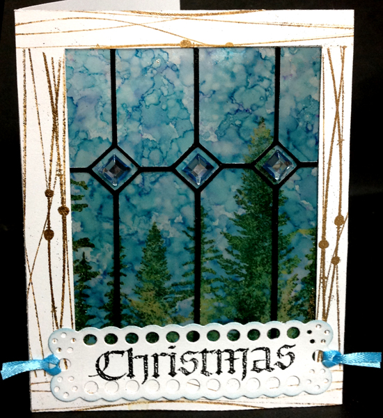I eCut my stained glass window, then scored and folded my card. Masked the edges with post it notes and colored the lead with a black marker, then applied Versamark and embossed with black embossing powder. Removed the masks. Stamped the linear design around the edges with Versafine Toffee and embossed with Queen's Gold. Stamped the word "Christmas with Versafine Black Onyx on white cardstock, clear embossed. Die cut with Spellbinders "Polka Dots" set. Hit the edges with a dirty blue sponge. Tied some blue narrow ribbon and adhered it to card front. On a piece of drafting vellum I pounced a felt pad with "Pool" & "Stream", then added "Pearl" and blending solution. Dried. Stamped the fir trees (Impression Obsession CAC "Pine Trees") using Versafine mini pads in both green colors then embossing with Distress "Pine Needles". Adhered the vellum to the back of the window. Added light blue square rhinestones as faux bevels. |