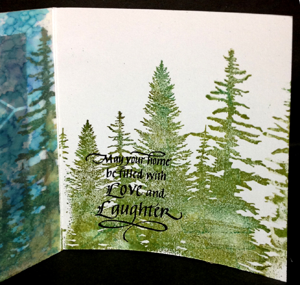On the inside stamped the trees again using Distress pads "Shabby Shutters", "Forest Moss" and "Pine Needles". Stamped the quote with the Black. |