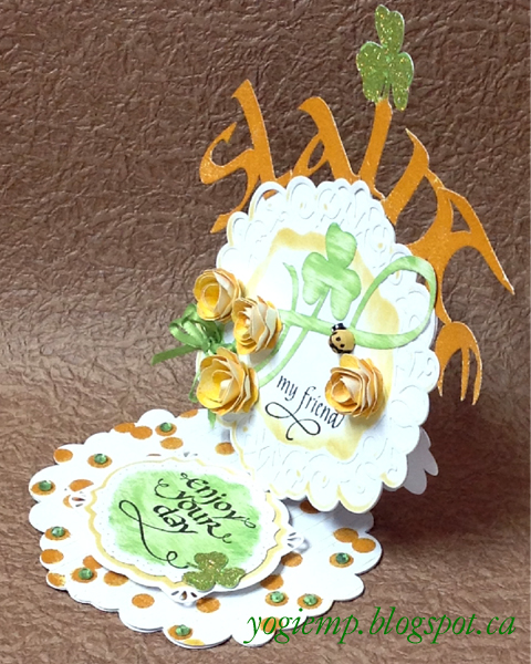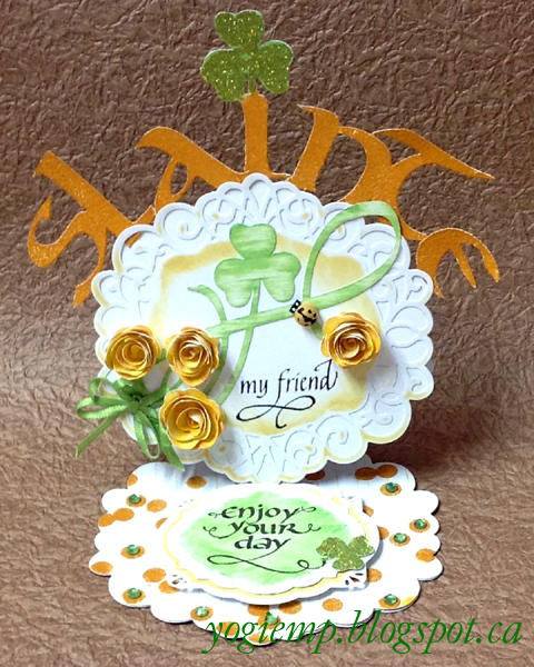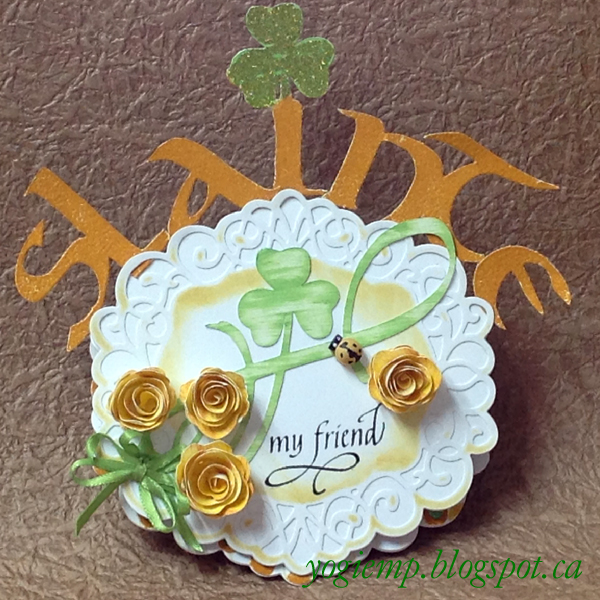 I die cut the largest of the Creative Expression (Sue Wilson "Scandinavian Collection - Stockholm") set for the front of the card, sponged through the die using Distress "Scattered Straw". (I used both the scrolled part and the outside edge. Then cut an under layer using just the outside edge die. For the easel part, I folded my cardstock in half, placed the outside edge die just slightly over the folded edge and die cut, then folded the front half in half to create the easel. Adhered the solid base. eCut the word "Slainte" at approximately 6" wide. Colored with Distress acrylic daubers "Mustard Seed" while still on the mat. Removed from mat and applied Versamark all over (except the shamrock) and embossed with a yellowish embossing powder "Honey". Applied Quickie Glue pen to the shamrock and sprinkled with Glitter Ritz micro fine glitter "Chartreuse". Cut a bit between some of the letters to allow me to curve the word, and glued it to the front edge, just on the tips of the letters. Adhered the scrolled piece. eCut the Shamrock Flourish in 2 sizes - 1 at approx 2." and 1 at 4". While on the mat, swished a "Mowed Lawn" acrylic dauber over the flourishes leaving streaks - almost like a dry brush technique. Removed from mat and adhered the larger one to the front of the card. Masked off the quote stamp with a piece of tape to leave only the "my friend" for inking with Versafine Black Onyx. Removed the tape and stamped, then clear embossed. |