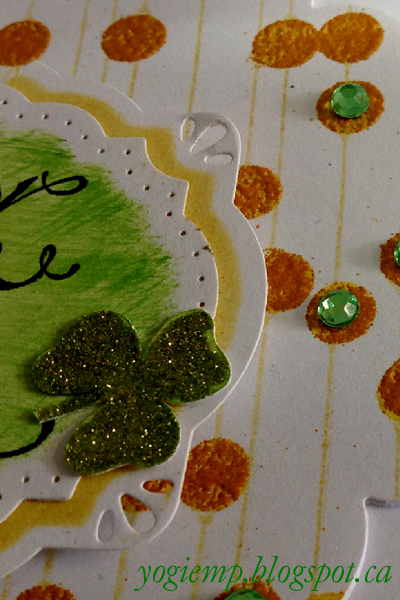 Die cut another solid piece for the floor. Inked up a Hero Arts "Bead Background" stamp with Scattered Straw, misted with water and stamped. Dried. Used the eraser part of a pencil, inked with Mustard Seed and stamped on each of the beads, then embossed with the Honey. (see detail pic below). Adhered to floor. Die cut the 2 small solid pieces, sponged the larger one with the Mustard Seed. The smaller one I used the Mowed Lawn dauber, streaking the surface through the die. Removed from dies and adhered together. Stamped the sentiment with the black and clear embossed. Cut off the shamrock from the smaller flourish I cut above, applied glue and sprinkled with the Chartreuse glitter. adhered to flourish end of sentiment. Used 3D foam tape (a double layer) , positioned it on the floor and then fussy cut a little notch for the front to fit in to use as a stopper. Adhered the die cuts. as a final touch added some light green rhinestones to some of the dots.