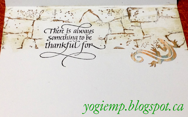 inside On the inside stamped the quote using Versafine Black Onyx and clear embossed. Cut a mask and stamped the brickwork (Kaiser Craft) inking with Distress mini pads ("Pumice Stone", then here and there with the burlap, misting with water prior stamping. Swiped "Antique Linen" over the whole design. I had cut a 2nd lizard, painted with Distress in orange and blue and adhered it. |