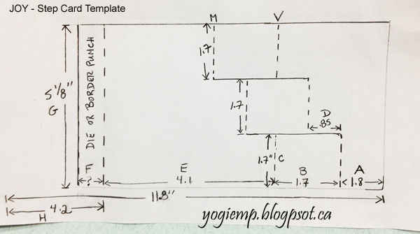 A - should be minimum - a touch larger than your step width. PS the back piece is not the same width as the finished card. B & C - is the width & height of your letter squares plus any borders. D - is half the width of your step width. E - will be the width of your finished card. F - is whatever's left over to create the die cut border. G - is the height of your finished card. H - will be the width of your finished card - just a touch larger. I cut the front green piece 4.2"w x 5.15"h |