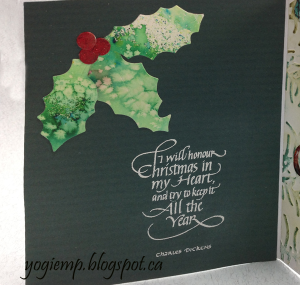 Inside Front Flap: Die cut the holly leaves and berries from watercolor paper decorated with various green/yellow/red Color Burst and salt. Applied Quickie glue to the berries and sprinkled with red glitter. Adhered to card Stamped the quote with Versamark and embossed with white embossing powder. |