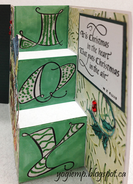 Stamped the "JOY" letters on to white cardstock with the black, masking each to have enough room around each letter to cut out the squares, clear embossed. Cut around each letter to the size of my steps, minus a touch. Colored the edges of the stairs with the same Prisma Premier marker I used to color the background of each letter. Doodled a design on the larger sections of each letter using a Quickie Glue pen and sprinkled with green glitter. Let dry and then adhered to card. Back panel: Stamped the quote with the black on white cardstock and clear embossed. Trimmed down and layered to a piece of the green cardstock and trimmed. Adhered to card. Added the leftover cut piece from the holly flourish and added a couple red rhinestones. |
