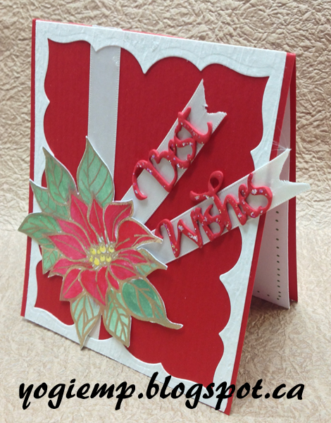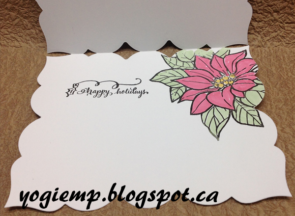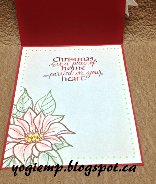 On the inside: stamped the poinsettia again with the black and clear embossed. Colored with Prisma colored Premier markers. Stamped the sentiment with the black and clear embossed. |