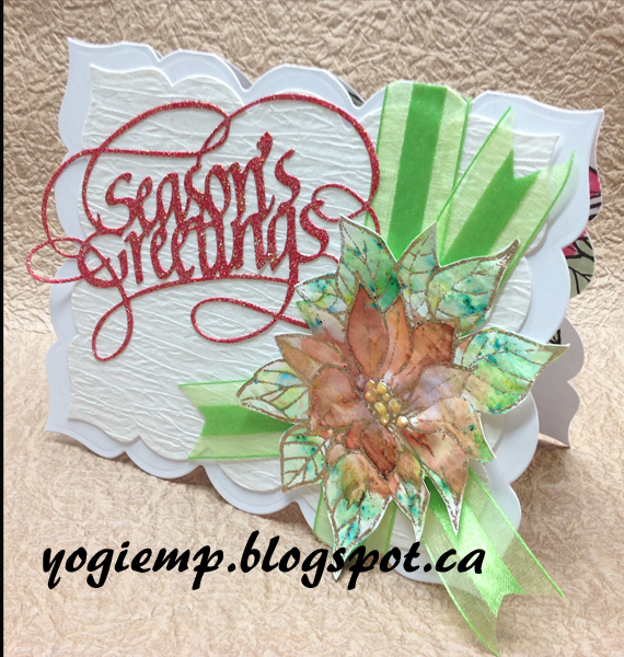 Top folded my white card and ran through my machine with Spellbinders Grand scalloped die Die cut the smaller scalloped rectangle from white Ruche cardstock, adhered to front. Adhered the green gauze ribbon. Stamped the poinsettia (Stubby Stampers) using Versamark on Terra Skin "Paper" (not actually paper but made from stone) and embossed with "Queen's Gold" embossing powder carefully. But even so, it warpped a bit which I liked.... Spritzed with water and sprinkled with Brushos. Dried naturally. Fussy cut around the outside edge. Adhered to ribbon adding some picot ribbon ends. Die cut the "Season's Greetings" from white cardstock, inked with Distress "Festive Berry" and embossed with "Red Dragon" embossing powder. |
