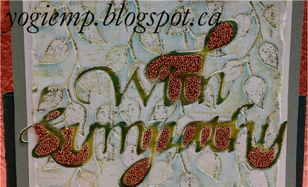 Inked the embossing folder with Distress "Shabby Shutters" & "Forest Moss", misted with water, inserted my white cardstock on the uninked side, and ran through my machine. Hit the high points, direct to paper with "Tumbled Glass". Distressed the edges using Tim's distressing tool. Die cut the words both from the embossed piece and a separate piece of white cardstock colored with some green - when die cut, hit the top with another green. Removed the die cut piece from the embossed cardstock. Adhered a piece of double sided tape to the back and started inlaying the words cut from the green colored cardstock. Sprinkled holeless copper beads in the negative spaces. Adhered this layer to a white cardstock then on to a light sage green cardstock. Tied a piece of green twine around the layers, then adhered to the side folded dark green textured cardstock that was a scrap piece on my desk... |