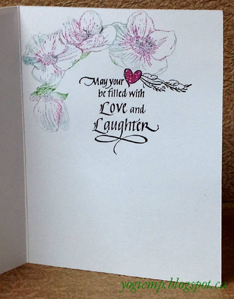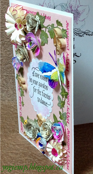 I side folded my white card. Adhered a piece of Bazzill monochromatic texture light pink cardstock leaving a 1/8" border all around. Stamped the "Happy Birthday" around the edges using Distress "Picked Raspberry". The cone flowers are made from 1/2" and 3/4" textured paper circles. After the cones were shaped and glued, I hit the edge with the Raspberry, then touched the ink with a wet paint brush to make the ink bleed and diffuse. Adhered the cones to another smaller circle then added the large pink rhinestone. As I mentioned above, the colorful flowers are die cut from alcohol decorated Yupo. The other roses are die cut from Reader's Digest gold edged pages, I cut of the gold edge part for the little leaves and the rest I die cut using Die-Namics "Royal Roses" set. I then added a yellow ladybug... The ivy (Creative Expressions "Trailing Ivy" set) die cut from white cardstock, then embossed, then painted with Distress acrylic Dauber "Peeled Paint" all over, dried and hit the leaves again with a "Forest Moss" pad, then touched here and there with dauber "Spun Sugar" and wiped excess off with my finger. Stamped the quote on white cardstock using Versafine Black Onyx, clear embossed. Die cut with Spellbinders "Scalloped Ovals" and ran thru my machine again to emboss the edge, then sponged a bit of pink around the edges. Adhered to front. Die cut the butterfly (Memory Box "Kaleidoscope BFly") from more of the Yupo. adhered it to some text paper, fussy cut around and adhered it with a glue gun to the card front. On the inside, stamped the wild roses (Magenta) inking with Distress mini pads (spun sugar, picked raspberry, mowed lawn & black soot) misted with water and stamped. Stamped the quote, removing the word "home" using the Versafine black and clear embossed. Inked the heart and flourish with the black, masking off the other side of the flourish, then stamping and clear embossing. Applied Quickie Glue and sprinkled with Stickles dry glitter "Thistle". |