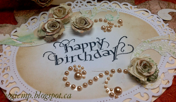 Adhered the decorative oval to floor using 3D foam tape. Some of the Gelli prints weren't that good, so used one of them (heavy weight paper "Columbia Mills End Paper") to die cut the roses (Die-Namics "Mini Royal Roses"). Assembled a whole bunch of them yesterday... Adhered the flourishes from my stash (Dee's Distinctively "Flourishes" several sets - stamped and embossed), then the roses. added the Sari ribbon bows. Final touch added the vintage toned pearl flourishes.