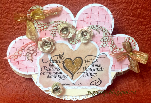 I die cut the mid size of the Spellbinders "Classic Hearts", and the rectangle shape (Spellbinders "Resplendent Rectangles"), both from white cardstock, sponged with Distress "Old Paper" and then some red. Adhered them together, making sure the heart in the quote would fall in the right place... Stamped the quote with Versafine Black Onyx and clear embossed. Applied Quickie glue and sprinkled with Glitter Ritz micro fine glitter "Gold". Die cut the largest heart (2 from white cardstock) sponged with red, embossed using Darice "Wire Fence" then hit the high points with "Festive Berries". Adhered them together so they would be no more than 7" wide. Scored and folded cream toned cardstock to create my easel, place my hearts and rectangle on the card and drew around the shape, then fussy cut, avoiding cutting the bottom section till later. Die cut the largest decorative oval (Spellbinders "Floral Ovals") from white cardstock. Sponged with the old paper. Stamped the sentiment with the black and clear embossed. Hand cut around the largest oval (Spellbinders "Petite Ovals Small") from cream toned cardstock. Adhered to floral ovals shape. Used the oval die to cut the bottom of my shape, then cut the top of the card to fit. I had some paper towels I had used to clean up my Gelli plates the other day, so adhered one of them to some heavy weight paper and die cut with the largest heart and adhered to floor. |