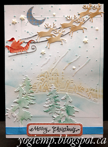 I scored and folded to create my easel, then cut another piece of white cardstock to create the accordion/floor, and another piece to layer on the front. The front piece I embossed with Cuttlebug "Winter House" embossing folder. Sponged some Distress "Tumbled Glass" in the sky area and "Antique Linen" on the houses. Touched the roofs with an embossing pen and embossed with white embossing powder to mimic snow covered. Applied Quickie glue to the smoke and sprinkled with Stickles dry glitter "Star Dust". Die cut the Santa sleigh (ImpressionObsession) and colored with Distress mini pads and Prisma colored pencils. Added stripes to the sleigh. Adhered to front. Added white rhinestone stars. Punched the moon (EK Success) from decorative scrapbok paper. Adhered a blue ribbon to the bottom of the card wrapping it around the edges. Stamped the sentiment using Versafine Black Onyx and clear embossed. Trimmed down and rounded the corners. adhered to a red crackle scrapbook paper, then on to the ribbon. Adhered this front piece to my easel. Covered the front of the accordions and the floor with a heavy white textured cardstock, putting a wavy line on the accordion pieces. |