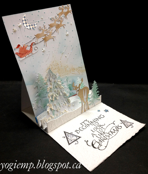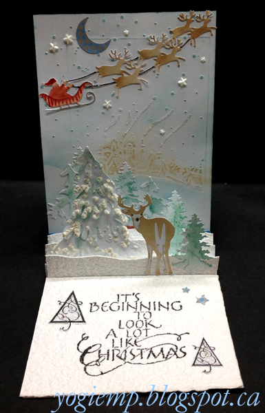 Die cut a bunch of Xmas trees (Sizzix Tim's Movers and Shapers "Mini Pine" die; Dee's Distinctively "Snow Covered Stacker Tree"; Taylored Expressions "Evergreens") from white cardstock and sponged with "Pine Needles" here and there, keeping white areas. adhered the smaller trees to the accordion or card front. On the stacker tree I applied White Puff paint and activated with a heat gun to puff up. Adhered that tree to the accordion. eCut the reindeer from white cardstock as well as a shadow/blackout layer. Sponged the top layer with the antique linen and adhered to the under layer. Colored the eyes and nose with a black marker. Adhered to accordion. Stamped the quote suing the black. PS the pad needs to be very juicy and the stamp press hard on to the textured paper. I like the rough look it gets. Stamped the flourished design trees on a piece of white cards and fussy cut around them, then applied Quickie glue and sprinkled with the star dust. Adhered to floor. Adhered the little stars, part of the punched out elements. I added a piece of mat board to the floor (hidden) to help with the stopping of the accordion/easel. |