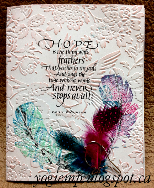 Created: July 2, 2015 A single layer creation... and wanted to use feathers... I have a few feather stamps, but decided I wanted one that I carved out... I'm using the quote on the front minus the flourished bird and a sentiment on the inside from Quietfire Design ("Hope is the Thing..." ); ("If You Don't Believe In Miracles" 3 pce set);