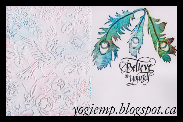 The feathers are Spellbinders "Peacock Feathers" set, cut from a scrap piece of decorated painted paper, then the high points inked direct to paper with some blue or green Stamped the sentiment with the black and clear embossed |