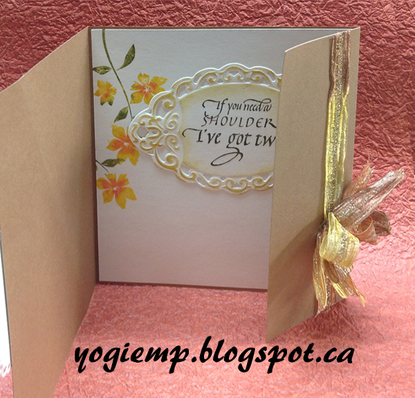 On the opposite flap, adhered a piece of brown/gold Sari ribbon. Tied a double loop fork bow with a separate piece of ribbon and adhered to flap with a glue gun. I positioned it so when the card is closed it's held closed by the bow... On the inside: Stamped the flowers again as above on white cardstock. Die cut the oval embossed piece, sponging with the straw. Stamped the quote with the black. Hit the high points of the oval with the straw pad. Adhered to inside.