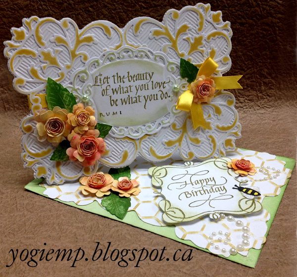 Created: June 27, 2015 A friend asked me to make a card for someone I know and they wanted yellow roses on it... Well I used a bunch of my very favorite dies I'm using a quote stamp on the front and sentiment & frame stamp set on the inside from Quietfire Design Stamps: ("Let the Beauty"); ("Happy Family Days" 5pce set)