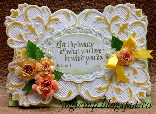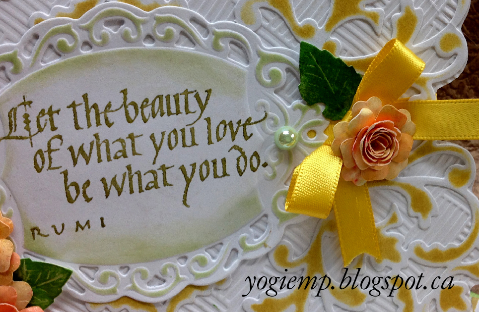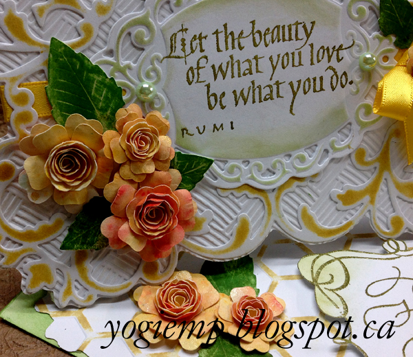 I scored and folded my easel card from white cardstock Die cut the flourished frame (Cuttlebug Anna Griffin "Flourish Emblem") from white cardstock, heavily sponged with Distress "Scattered Straw", removed from die and cut away the center area. Used the die to scan the outer edge and imported into my electronic cutter. Cut 2 of them from white cardstock. On the front one I dry embossed using Darice "Basket Weave". Adhered this layer to the front piece of the side easel. adhered a piece of narrow yellow satin ribbon, then the flourished frame. Stamped the quote on a separate piece of white cardstock using Versafine "Spanish Moss" and clear embossed. Die cut using Marianne Design LR0235 die set and sponged with a dirty green sponge. Adhered over the ribbon. Created a decorated paper using 67# white cardstock, misting both sides and bursting Brushos "Yellow", "Gamboge" and "Scarlet" misting with more water, moving some around with my finger, lifting most of the water off with a paper towel, then spraying with Perfect Pearls "Sunflower Sparkle" & "Perfect Pearls" mists. Dried thoroughly, then cut with my electronic cutter "Heirloom Hybrid Roses". I created the eCut from my die set, and wanted some that were smaller than the die... |