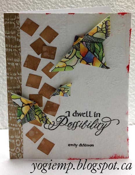 Created: June 18, 2015 Just got a bunch of the newest stamps from Quietfire Design and this one spoke to me. I had also been playing with making origami butterflies, so thought I'd use a few of them BIG GRIN This style came to my attention via The Paper Post and was found on "All Free Paper Crafts" ("I Dwell in Possibility" );