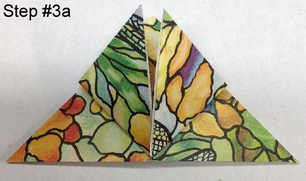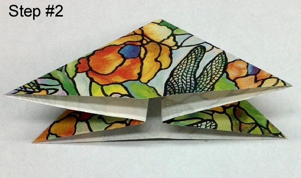 With right side facing up, pinch the diagonal line (mountain fold), while forcing the horizontal line (valley fold) down to create the folded triangle shape. |