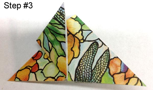 adhered a white paper napkin using a glue stick. Added some scraps that were on my desk, the left band and the little squares. Hit the edge with a Distress pad "Festive berry". Created the butterflies using Dover Origami paper pack "Tiffany Patterns" (3"sq, 2"sq & a 1"sq) Stamped the quote using Versafine Black Onyx and clear embossed. ORIGAMI BUTTERFLY TUTORIAL: Step 1 cut a square piece of light weight paper, copy paper or origami paper. Fold as shown horizontally (right sides together) and diagonally (wrong sides together). |
