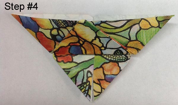 ![]() Fold the upper layer of triangle up and against the vertical crease line. Repeat with opposite triangle. |