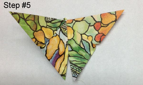 Turn butterfly over to underside and fold up the solid triangle. The point should just pass the top edge. Pinch that over the edge pressing down really hard. Also press down along the folded edge. Depending how far you have folded up, the bottom wing triangles may distort a bit. That's no problem, just fold the edge inward. |